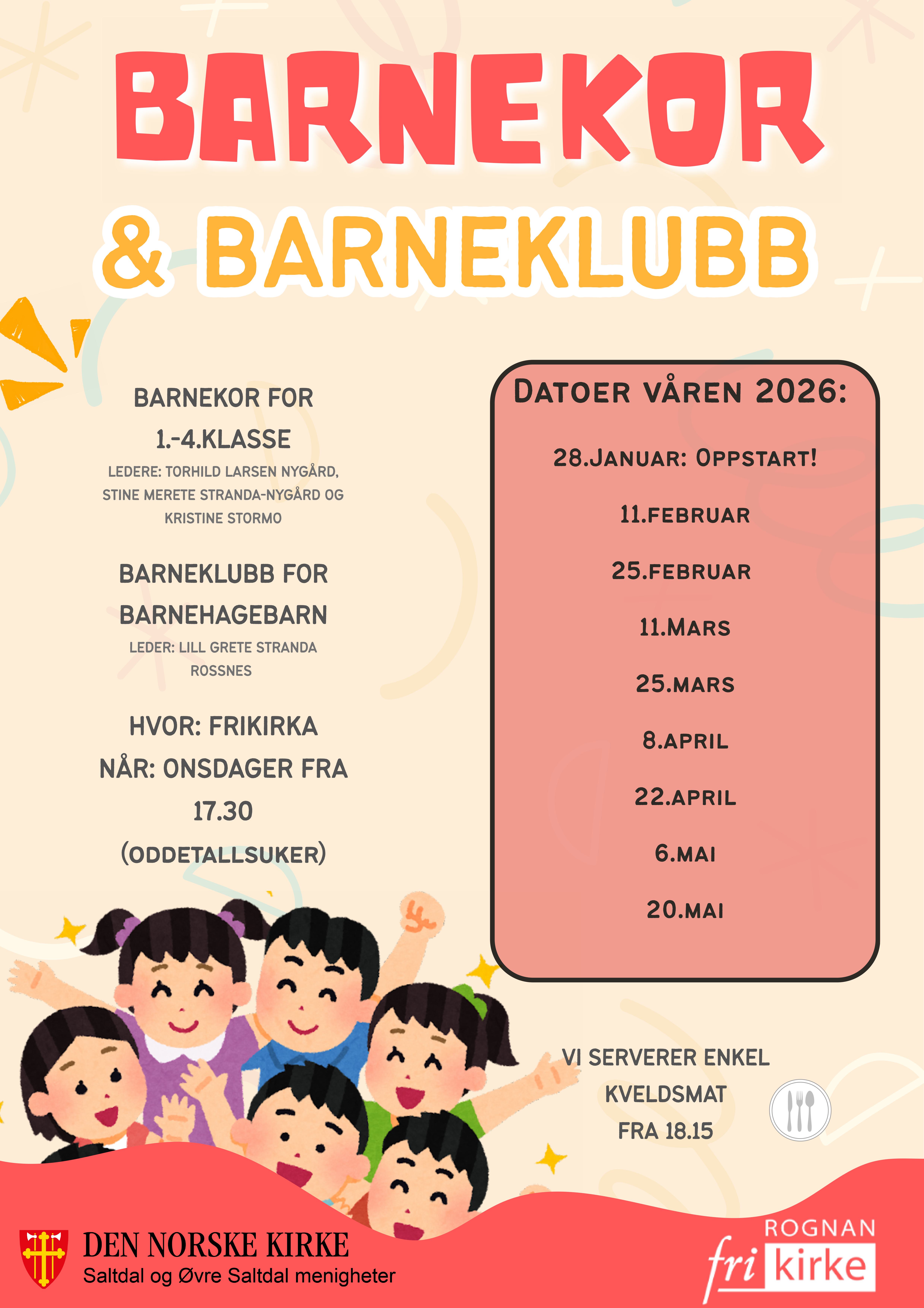Barnekor og barneklubb starter opp igjen etter jul! Første samling blir onsdag 28. januar i Frikirka kl. 17.00. Kveldsmat etterpå.
