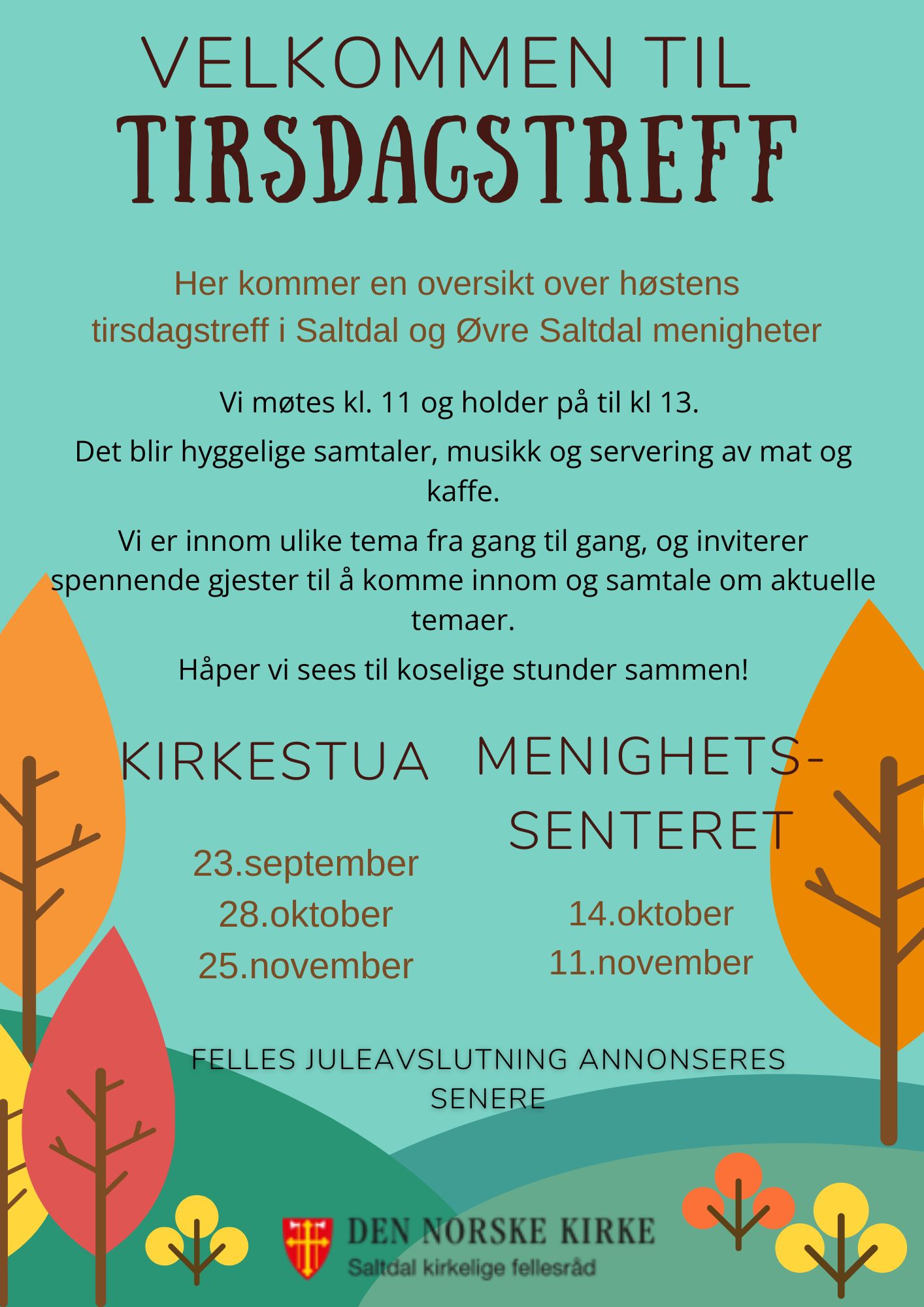 Onsdag 8. oktober kl. 11 - 12.30 inviterer vi til første treff i Lillesalen på Saltdal menighetssenter. Denne gangen koster det ingenting å være med - så det er en perfekt anledning til å komme og prøve.